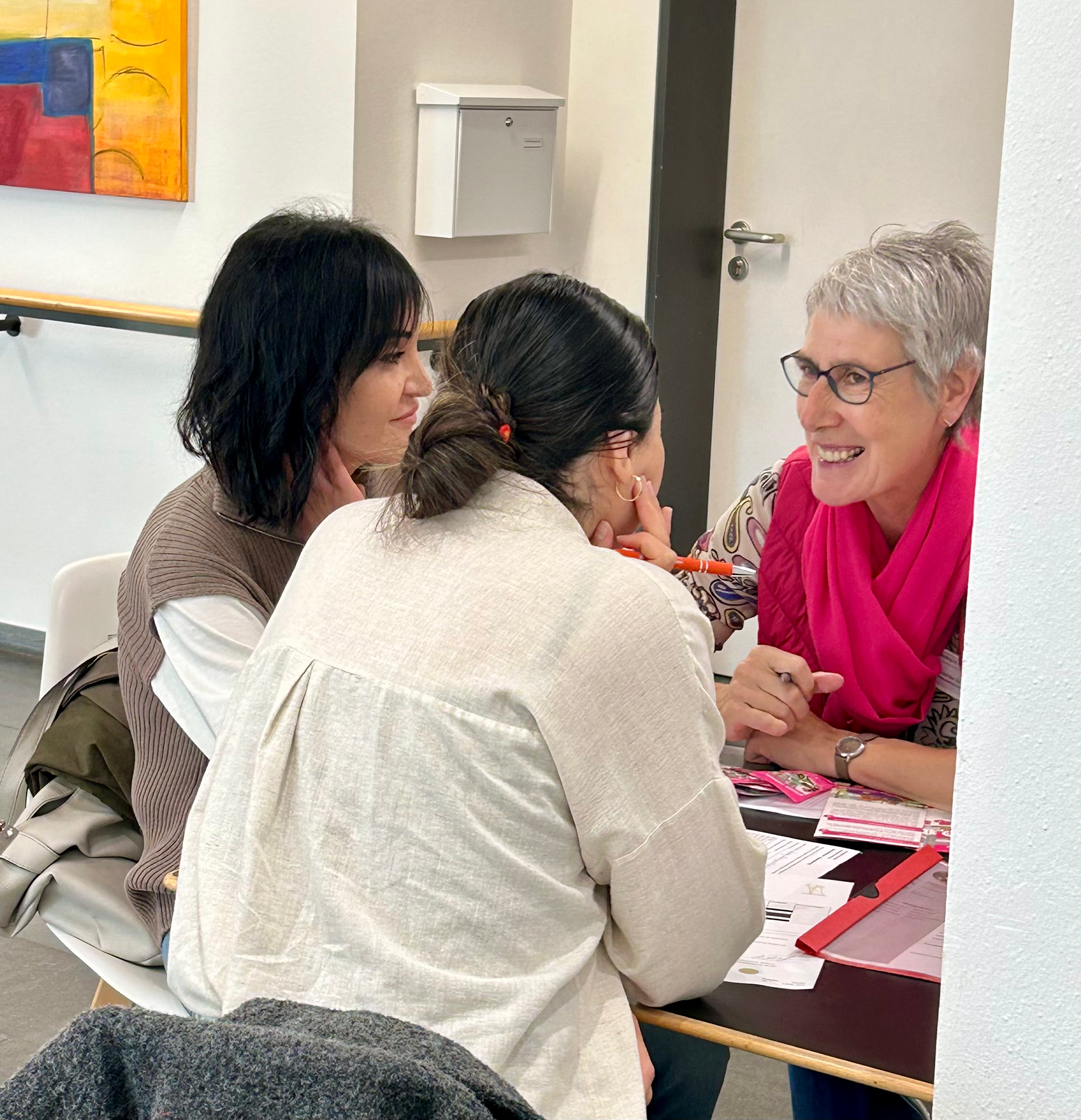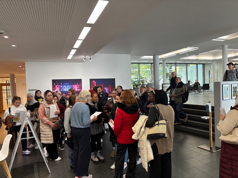 Großer Andrang vor den Toren der Vereinigten Hospitien, noch bevor es offiziell um 10 Uhr losging. Schülergruppen, Paare und Einzelpersonen suchten sich direkt die für sie relevanten Stationen, die im Stift St. Irminen und in der Reha die Einrichtungen und weitere Bereiche der Vereinigten Hospitien repräsentieren. Ruckzuck waren die Mitarbeitenden umgeben von Interessierten unterschiedlichen Alters, aus verschiedenen Ländern, Frauen wie Männern. In allen Räumen herrschte betriebsamer Trubel. Die größte Gruppe waren Schülerinnen und Schüler der BBS EHS, die mit Begeisterung die vielen praktischen Angebote wahrgenommen haben. Teils mit Gelächter, teils aber auch mit ehrfürchtigem Staunen wurden in der Reha die Brillen ausprobiert, die unterschiedliche Augenerkrankungen simulierten. Mit Begeisterung wurde unter der Anleitung der Mitarbeiterinnen des Ruländer Hofes eine Babypuppe gewickelt, und im Echternacher Hof konnten die meist jüngeren Leute bei einem Parcours ausprobieren, wie herausfordernd das Fahren mit einem Elektro-Rollstuhl sein kann. Das Helenenhaus zeigte, dass Hauswirtschaft viel mehr als Kochen und Putzen ist und die Verwaltung, dass das Zehn-Finger-Tippen im Büro keineswegs der Vergangenheit angehört. Die Zentralküche stellte sich unter dem Slogan "Ausbildung mit Geschmack" mit einer köstlichen Kürbissuppe vor, und der digitale Pflegeassistent Carlo verwies in die Zukunft der Pflege. Ergänzend waren auch Mitarbeitende der Arge und des Integrationsfachdienstes dabei, um die Vereinigten Hospitien als Arbeitgeber und Arbeit- oder Ausbildungsplatzsuchende zusammenzubringen.